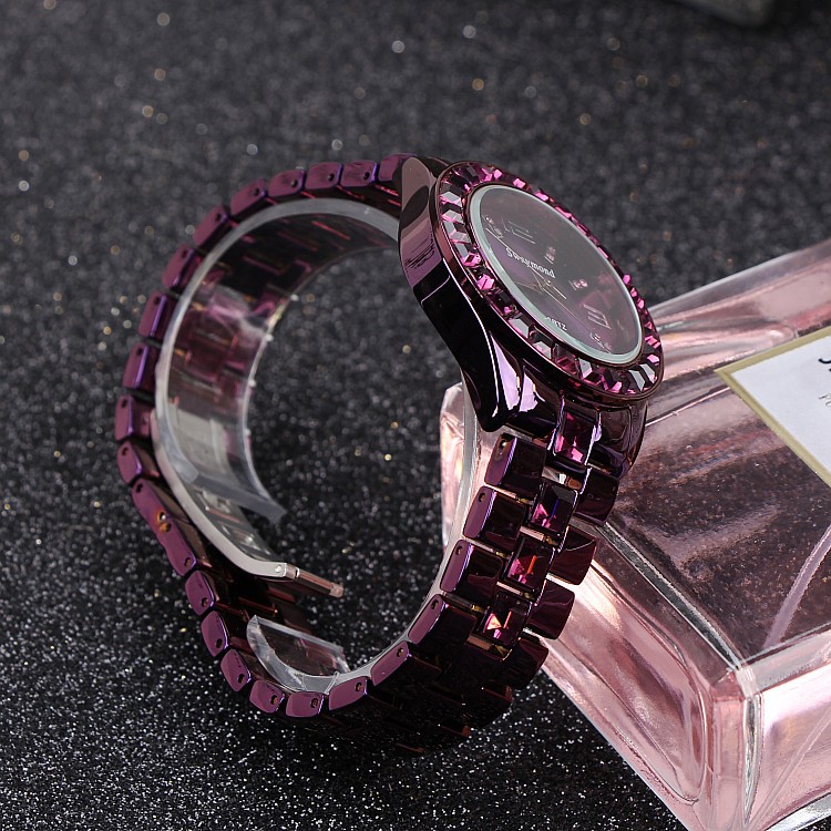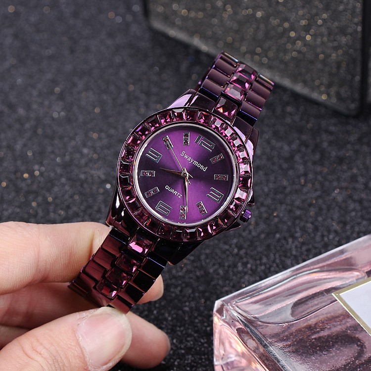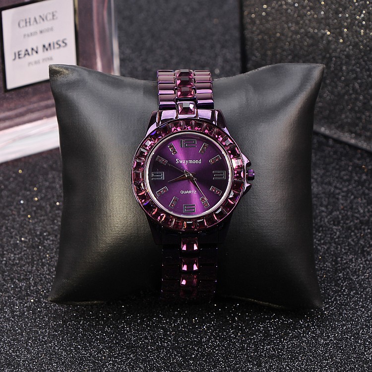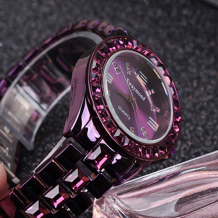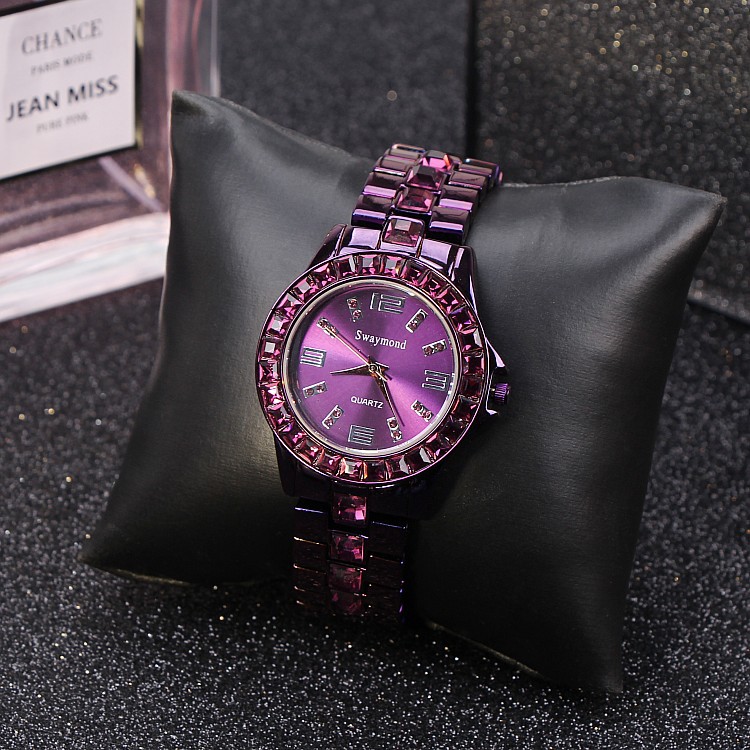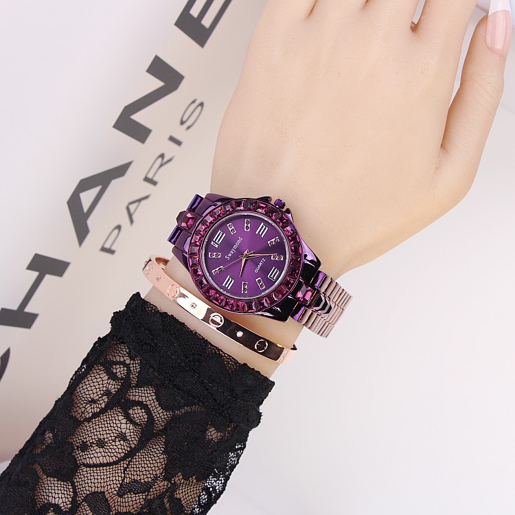 爆款 鑲鑽 耐用水晶滿鑽 時尚個性紫色鋼帶 女士手錶Wat59