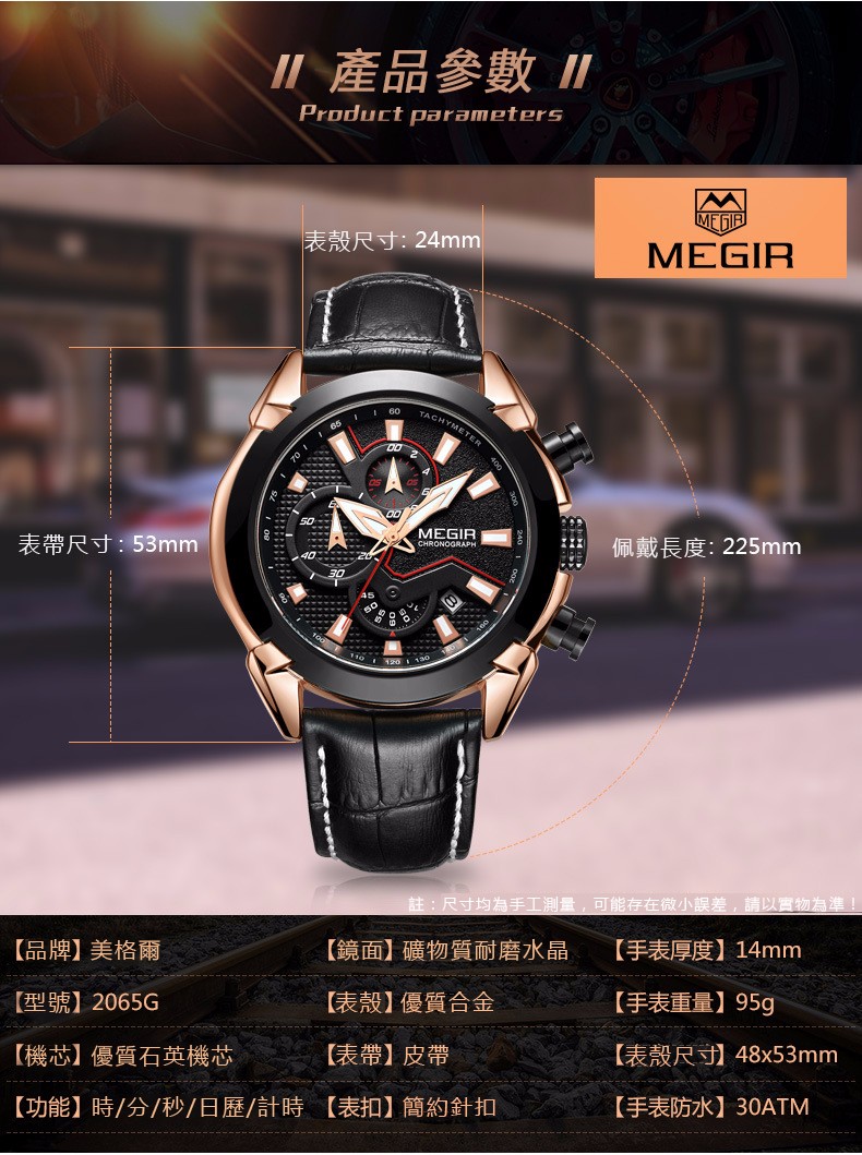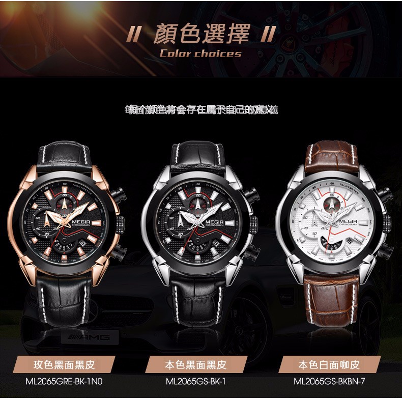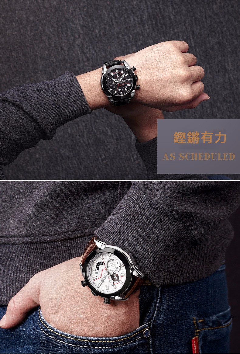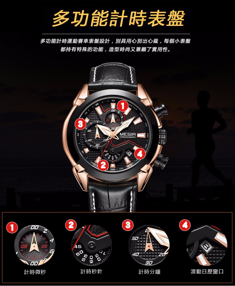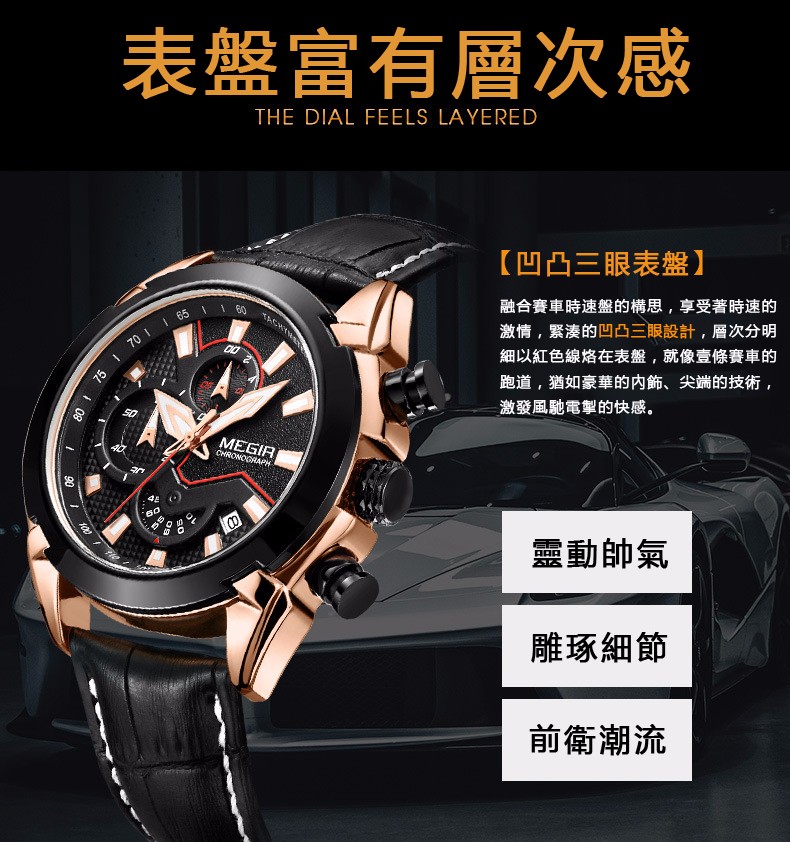 美格尔MEGIR運動夜光假三眼男士腕錶wat135