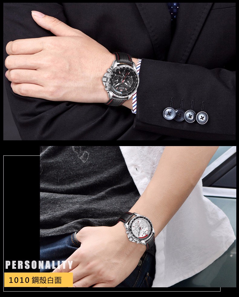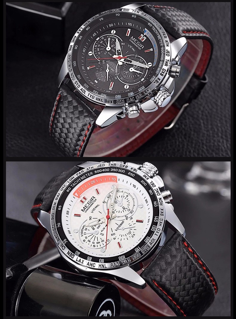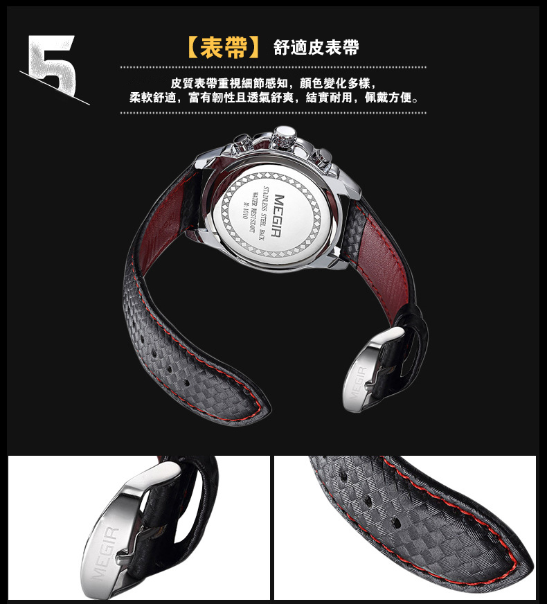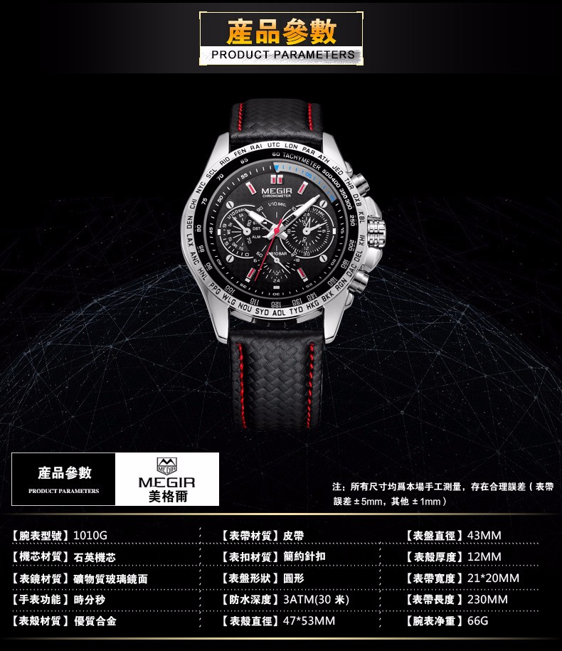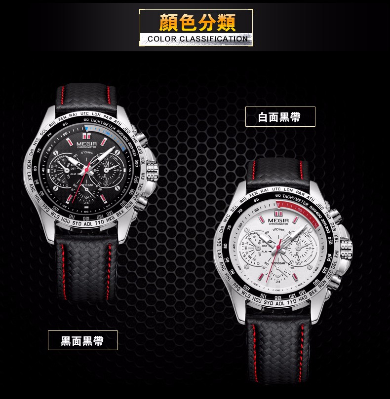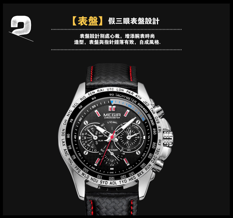 美格尔MEGIR運動夜光假三眼男士腕錶wat135