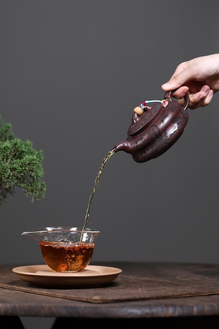 【泥料特點】砂土氣重,似淳實農民,日久使用,漸露鋒芒,養成變化,溫潤莊重。紫砂是壹種雙重氣孔結構的多孔性材質,氣孔微細,密度高。用紫砂壺沏茶,不失原味,且香不渙散,得茶之真香真味。紫砂使用越久,壺身色澤越發光亮照人,氣韻溫雅。紫砂壺長久使用器身會因撫摸擦拭,變得越發溫潤光澤。