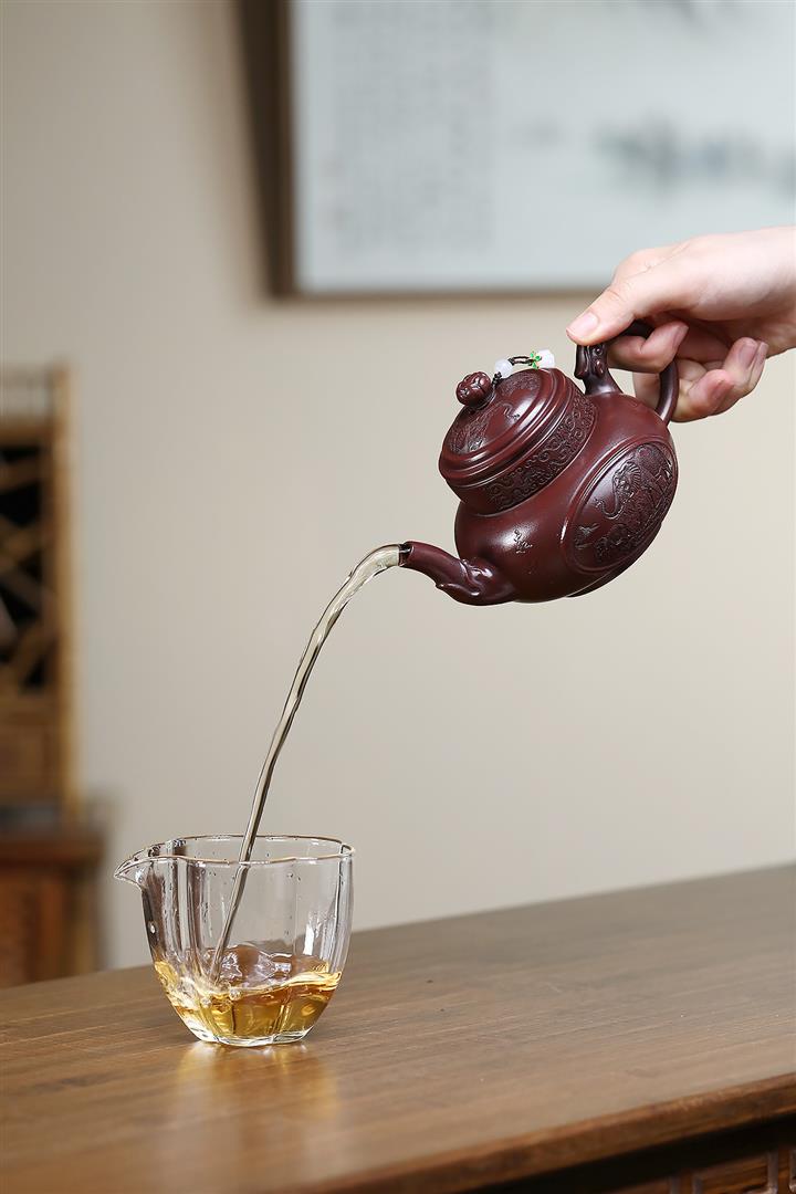 【泥料特點】砂土氣重,似淳實農民,日久使用,漸露鋒芒,養成變化,溫潤莊重。紫砂是壹種雙重氣孔結構的多孔性材質,氣孔微細,密度高。用紫砂壺沏茶,不失原味,且香不渙散,得茶之真香真味。紫砂使用越久,壺身色澤越發光亮照人,氣韻溫雅。紫砂壺長久使用器身會因撫摸擦拭,變得越發溫潤光澤。