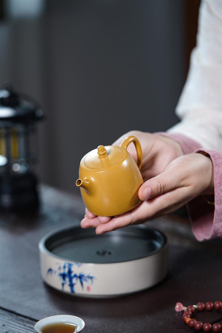 【泥料特點】砂土氣重,似淳實農民,日久使用,漸露鋒芒,養成變化,溫潤莊重。紫砂是壹種雙重氣孔結構的多孔性材質,氣孔微細,密度高。用紫砂壺沏茶,不失原味,且香不渙散,得茶之真香真味。紫砂使用越久,壺身色澤越發光亮照人,氣韻溫雅。紫砂壺長久使用器身會因撫摸擦拭,變得越發溫潤光澤。