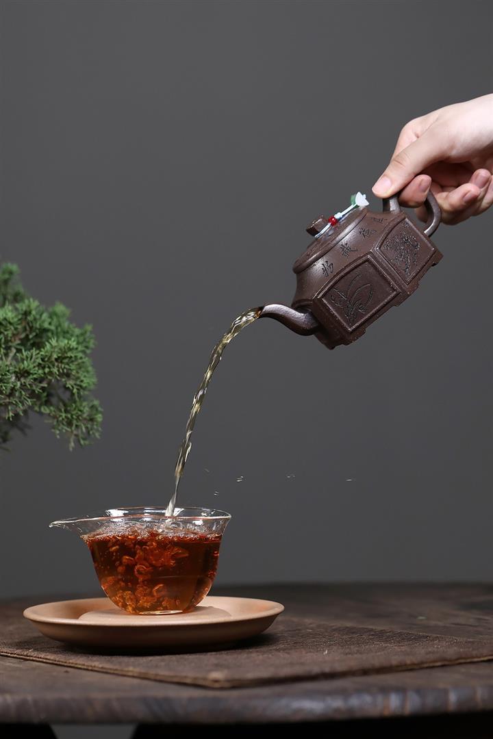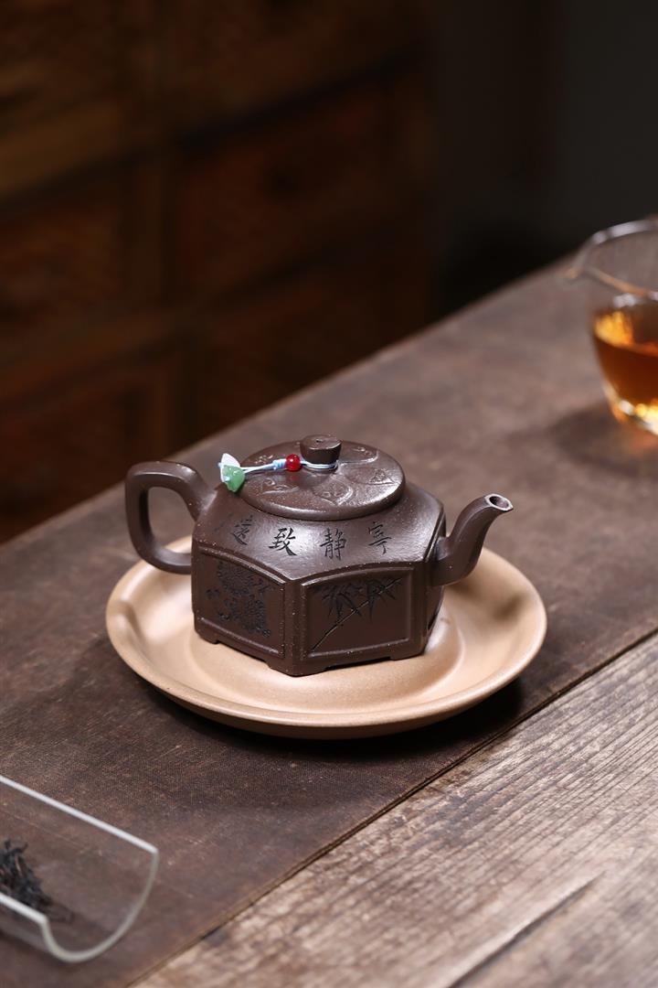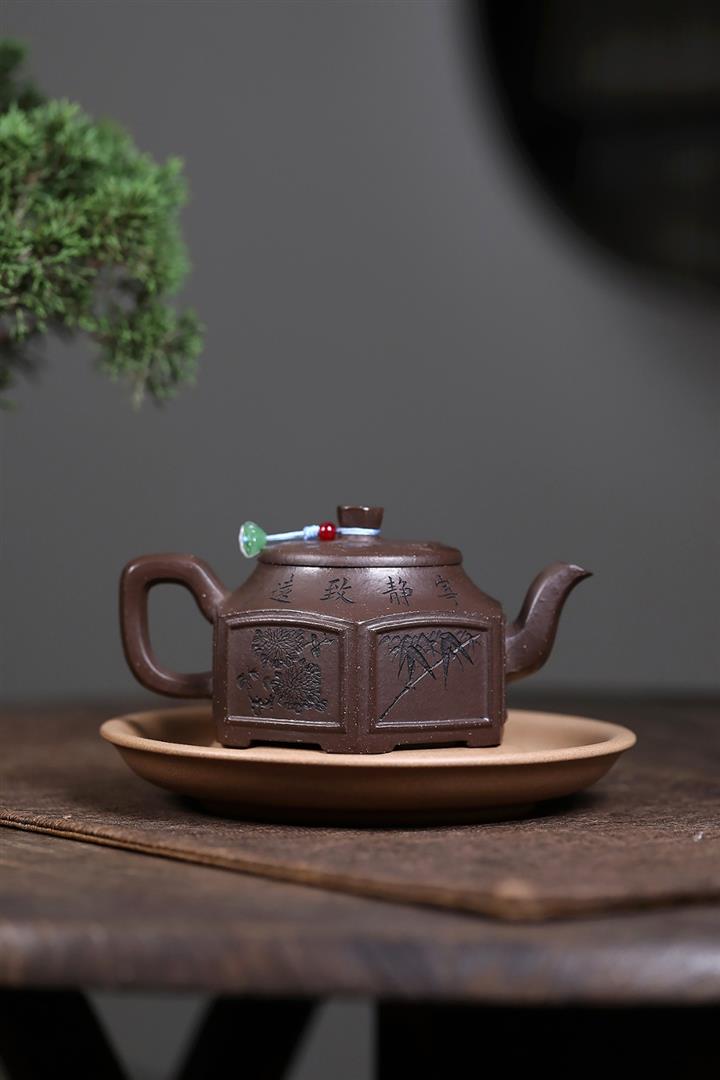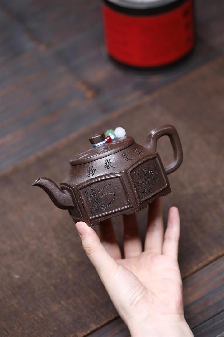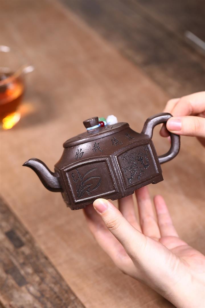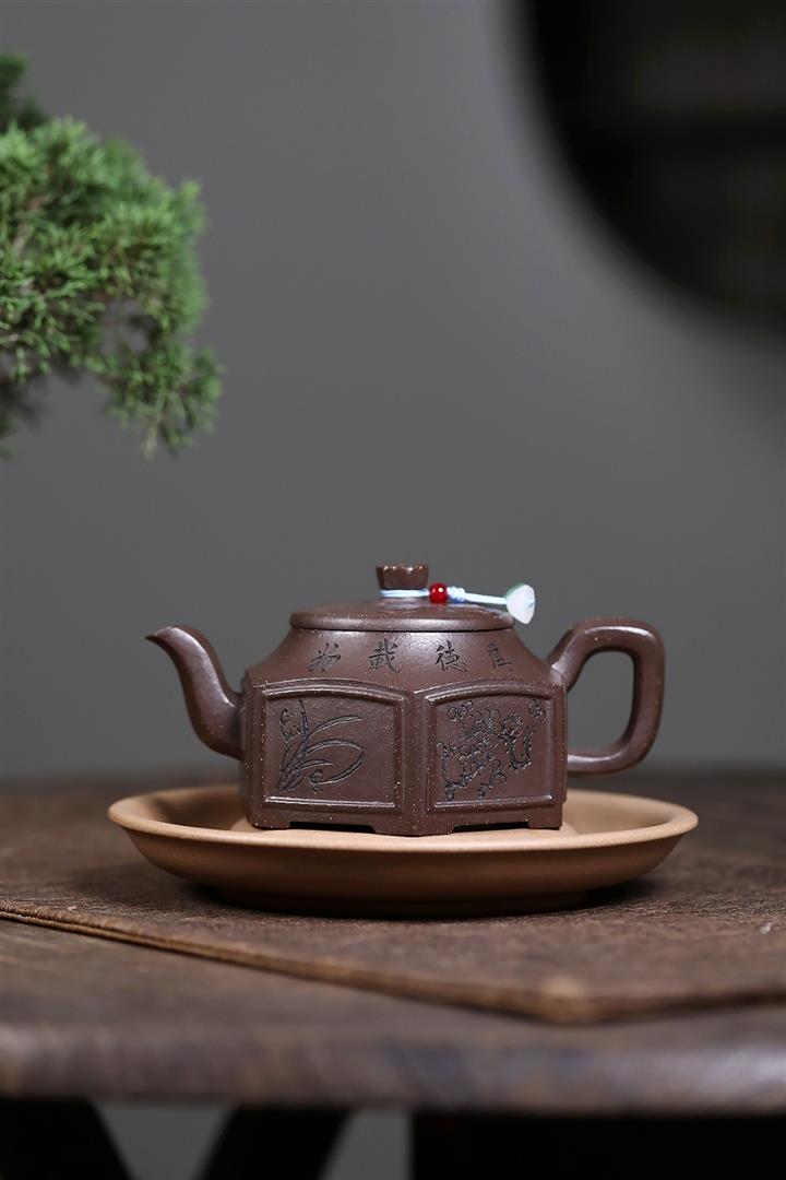 【泥料特點】砂土氣重,似淳實農民,日久使用,漸露鋒芒,養成變化,溫潤莊重。紫砂是壹種雙重氣孔結構的多孔性材質,氣孔微細,密度高。用紫砂壺沏茶,不失原味,且香不渙散,得茶之真香真味。紫砂使用越久,壺身色澤越發光亮照人,氣韻溫雅。紫砂壺長久使用器身會因撫摸擦拭,變得越發溫潤光澤。