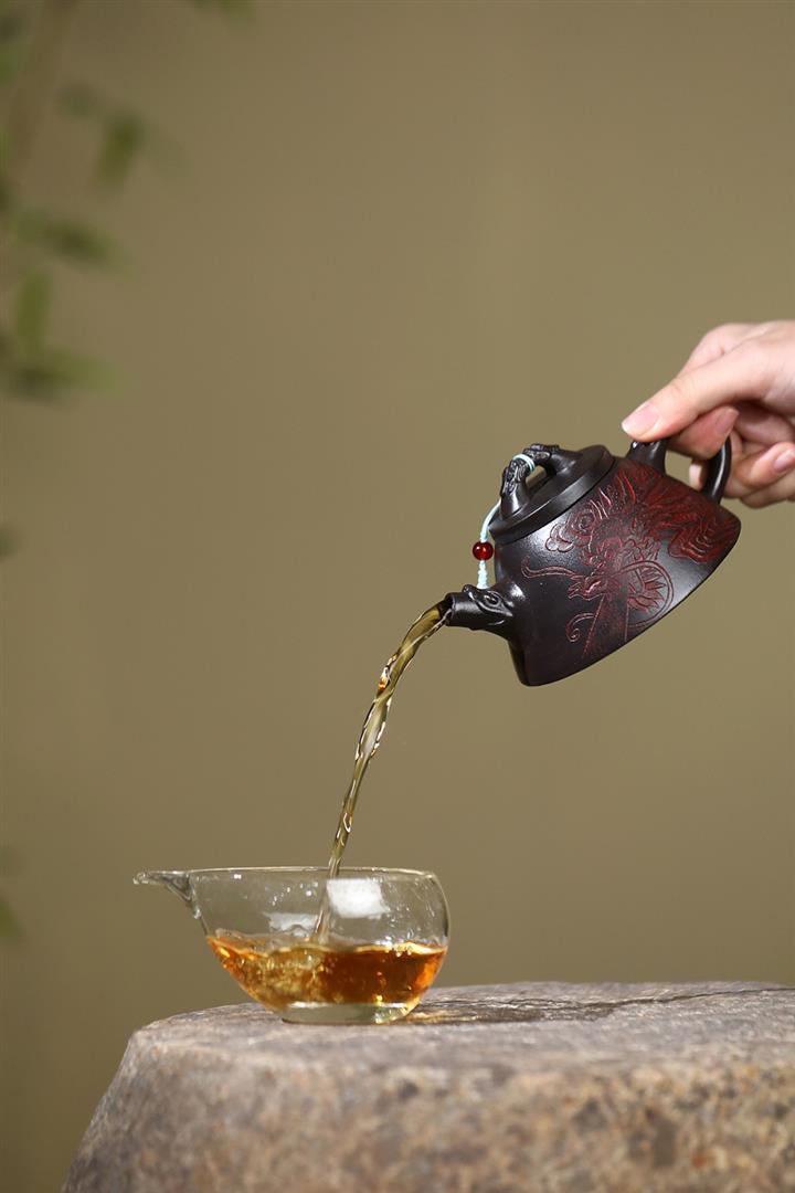 【泥料特點】砂土氣重,似淳實農民,日久使用,漸露鋒芒,養成變化,溫潤莊重。紫砂是壹種雙重氣孔結構的多孔性材質,氣孔微細,密度高。用紫砂壺沏茶,不失原味,且香不渙散,得茶之真香真味。紫砂使用越久,壺身色澤越發光亮照人,氣韻溫雅。紫砂壺長久使用器身會因撫摸擦拭,變得越發溫潤光澤。