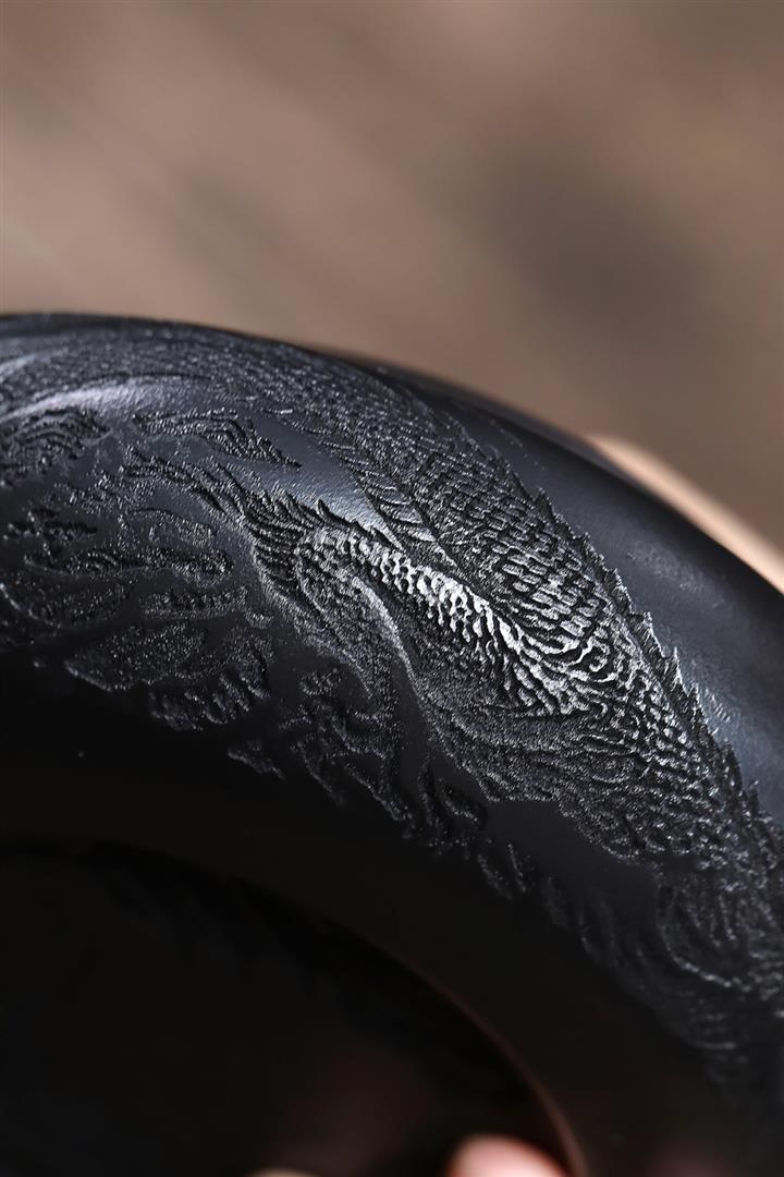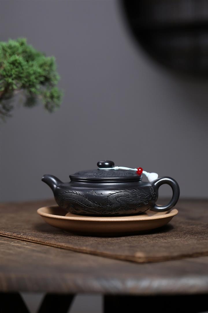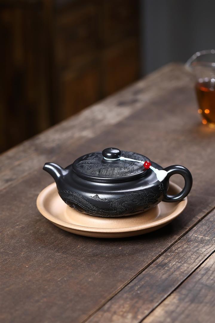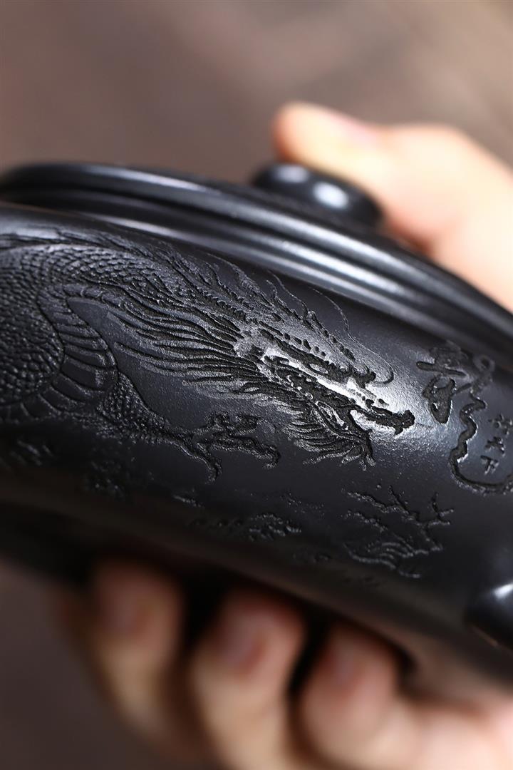 原礦石黃泥龍紋扁腹滿刻茶壺POT7723