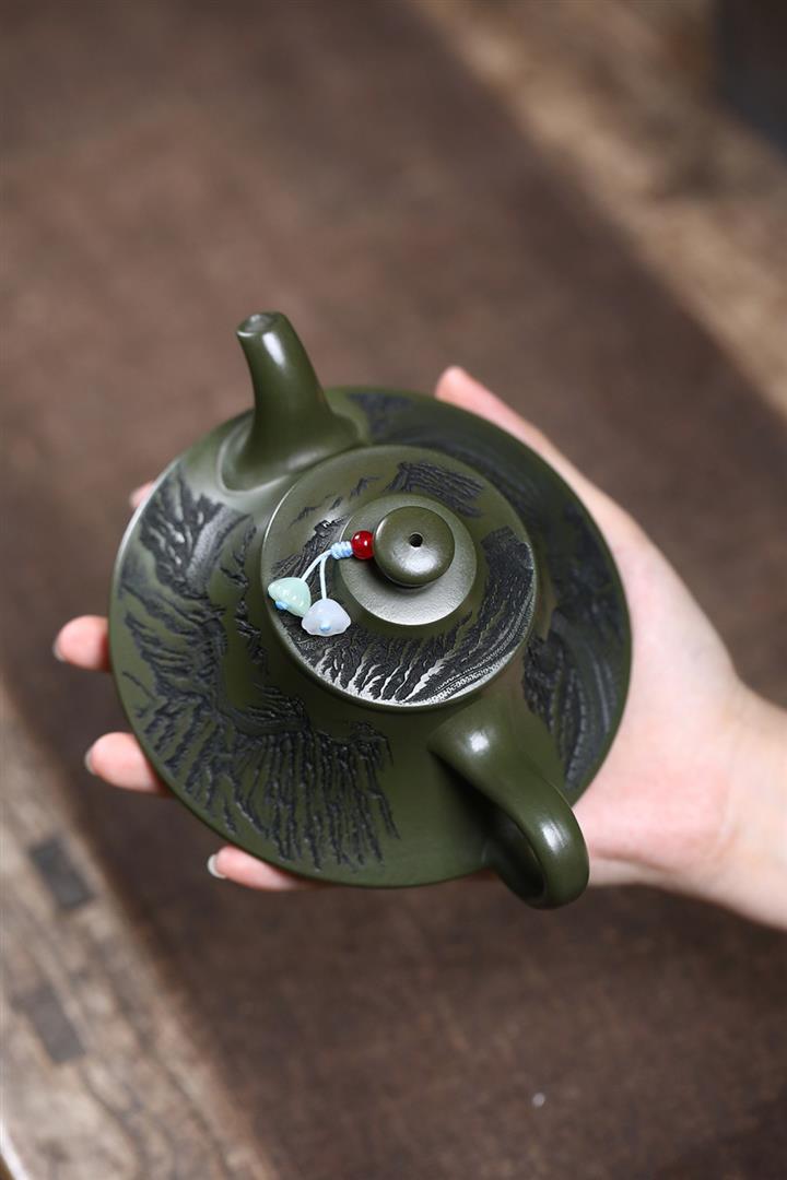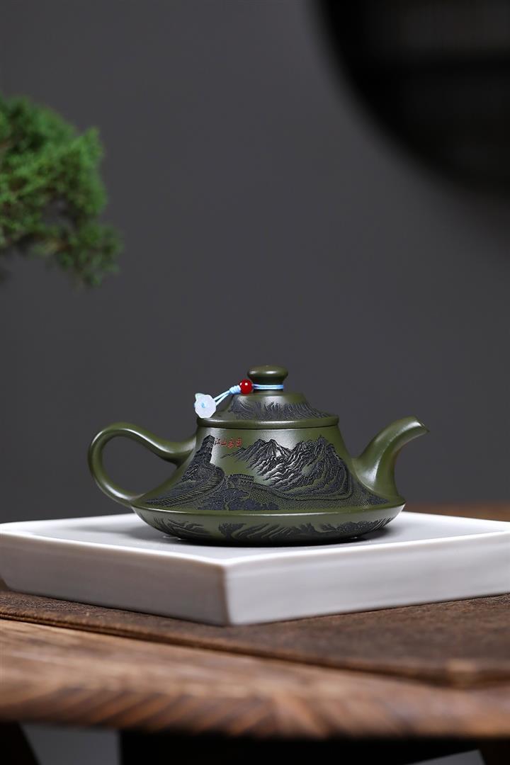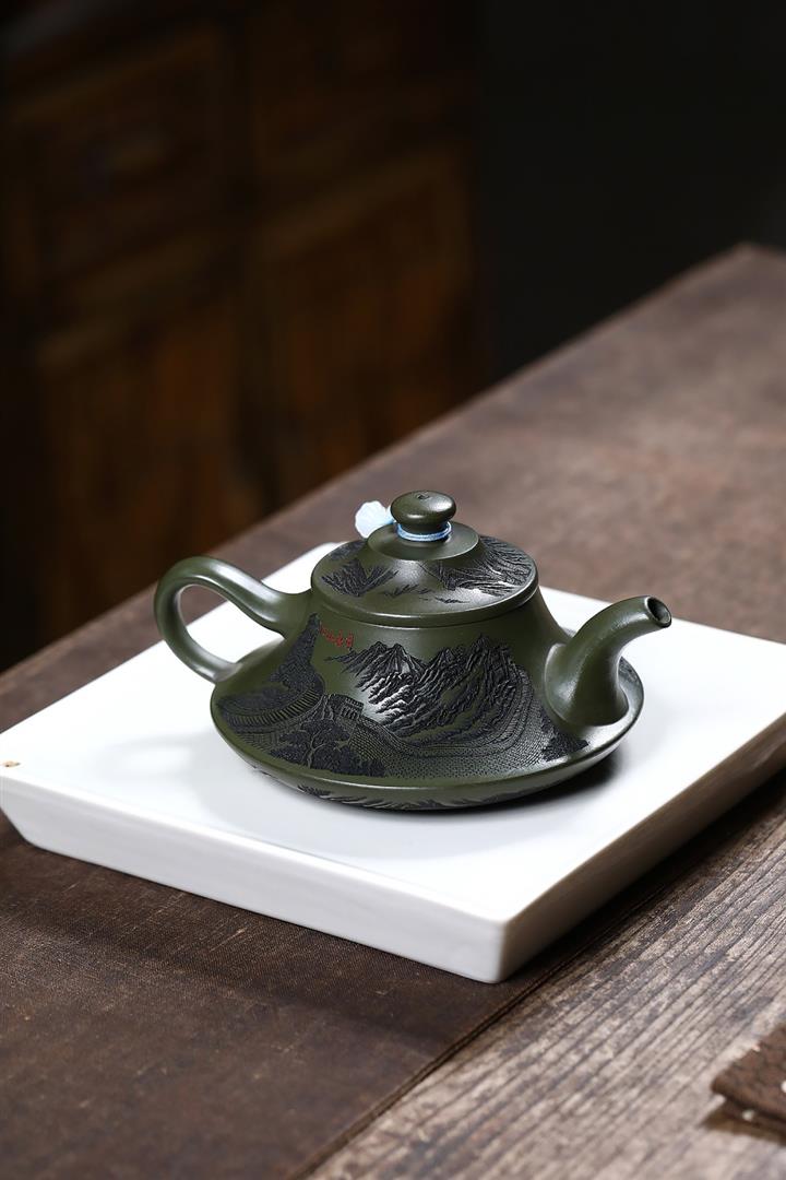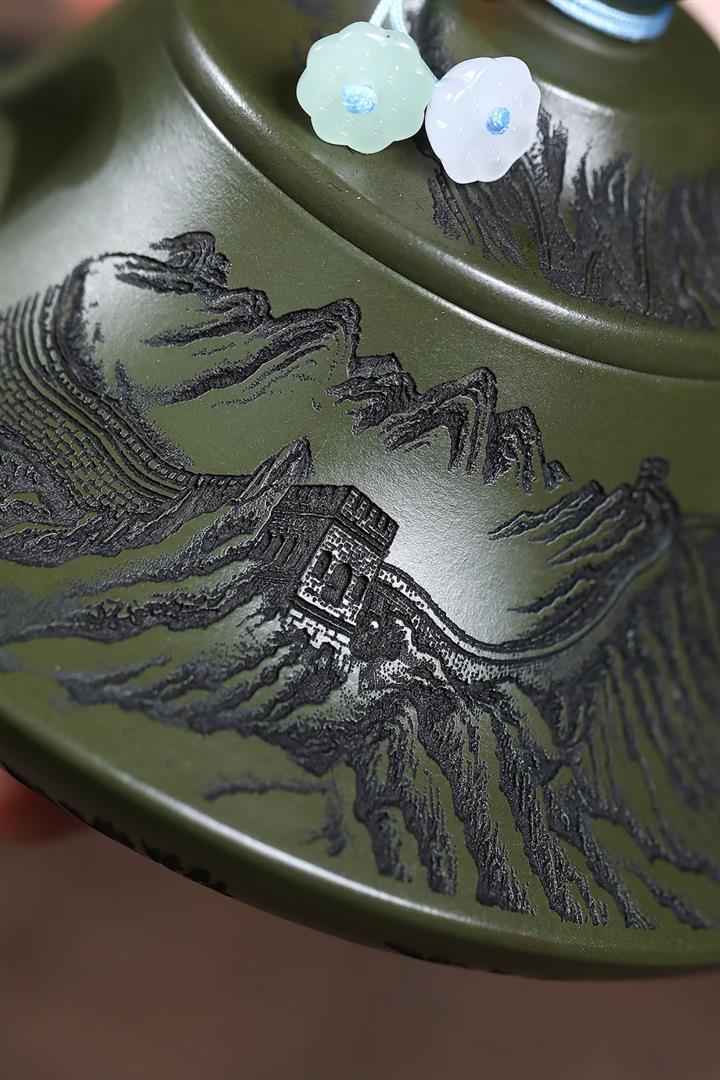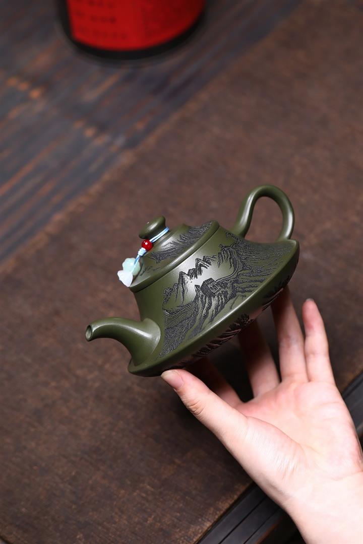 400cc原礦綠泥滿刻江山如畫壺POT7982