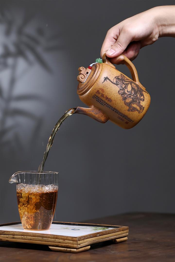 【泥料特點】砂土氣重,似淳實農民,日久使用,漸露鋒芒,養成變化,溫潤莊重。紫砂是壹種雙重氣孔結構的多孔性材質,氣孔微細,密度高。用紫砂壺沏茶,不失原味,且香不渙散,得茶之真香真味。紫砂使用越久,壺身色澤越發光亮照人,氣韻溫雅。紫砂壺長久使用器身會因撫摸擦拭,變得越發溫潤光澤。