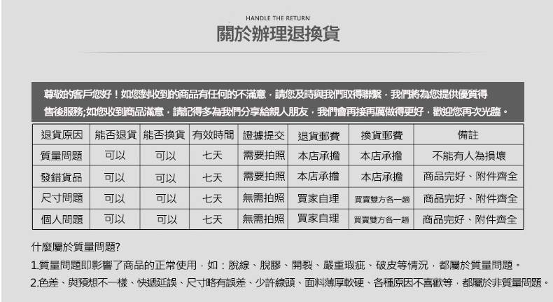 至收到商品之日起7天內,向售後服務中心發送郵件至 Greencatbeat@gmail.com,客服會在收到郵件后的1-3個工作日內受理您的請求,退換貨所產生的運費由我方承擔。