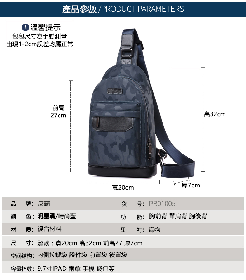皮霸男士胸包Piba13