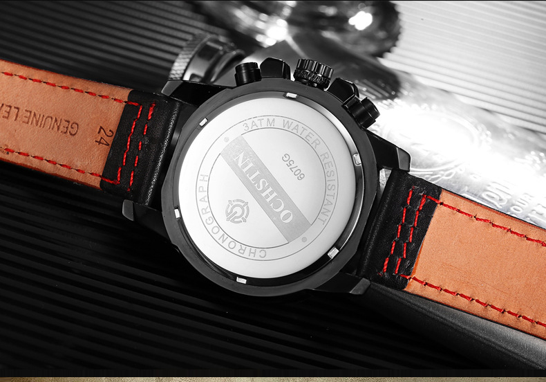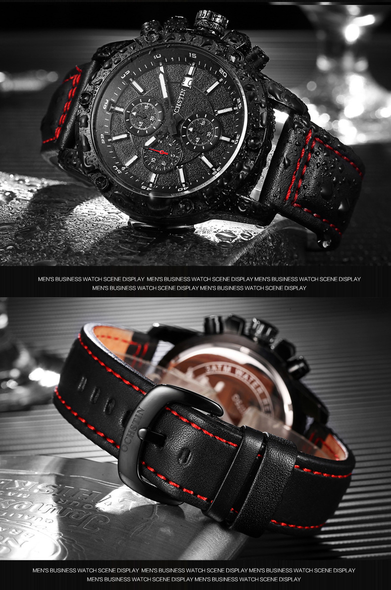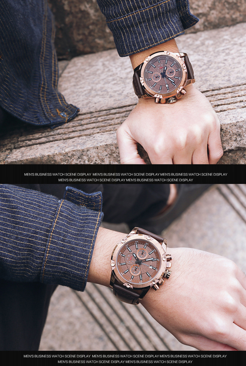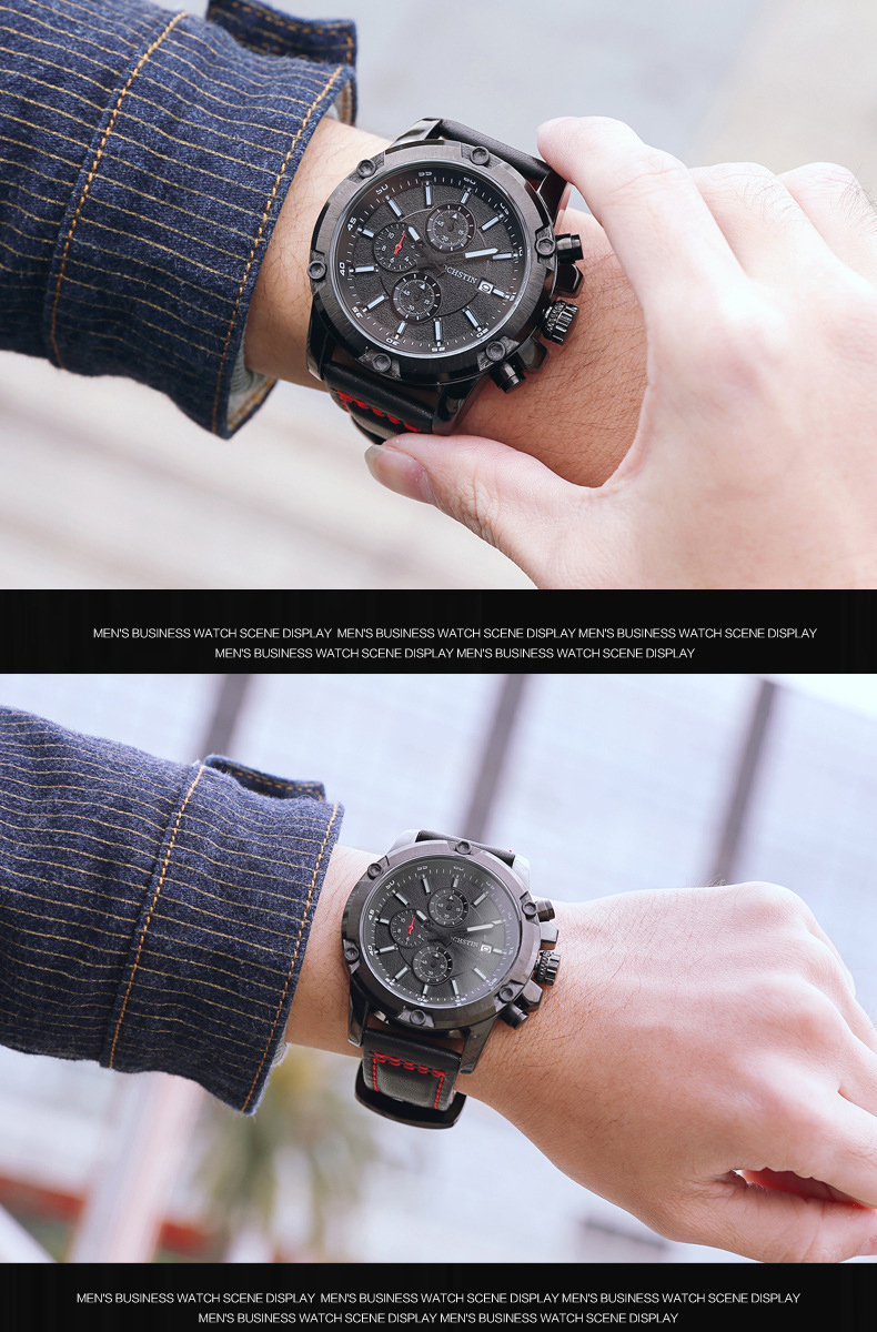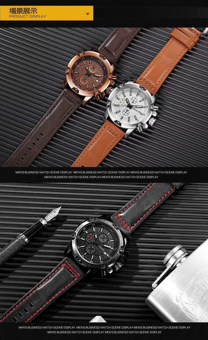 石英日曆腕表真皮男士六針運動防水錶Wat29