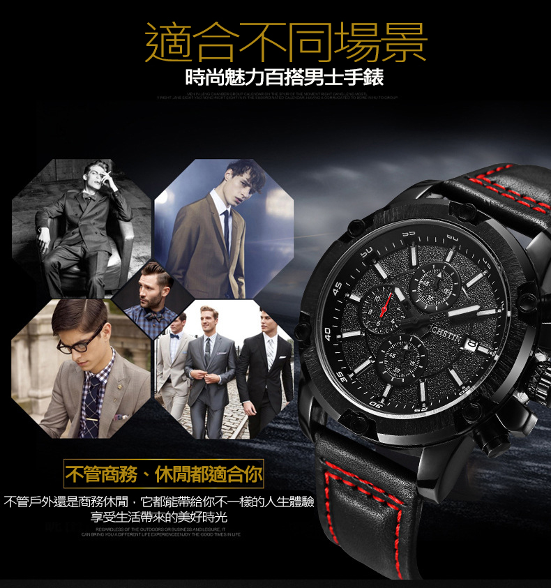 石英日曆腕表真皮男士六針運動防水錶Wat29
