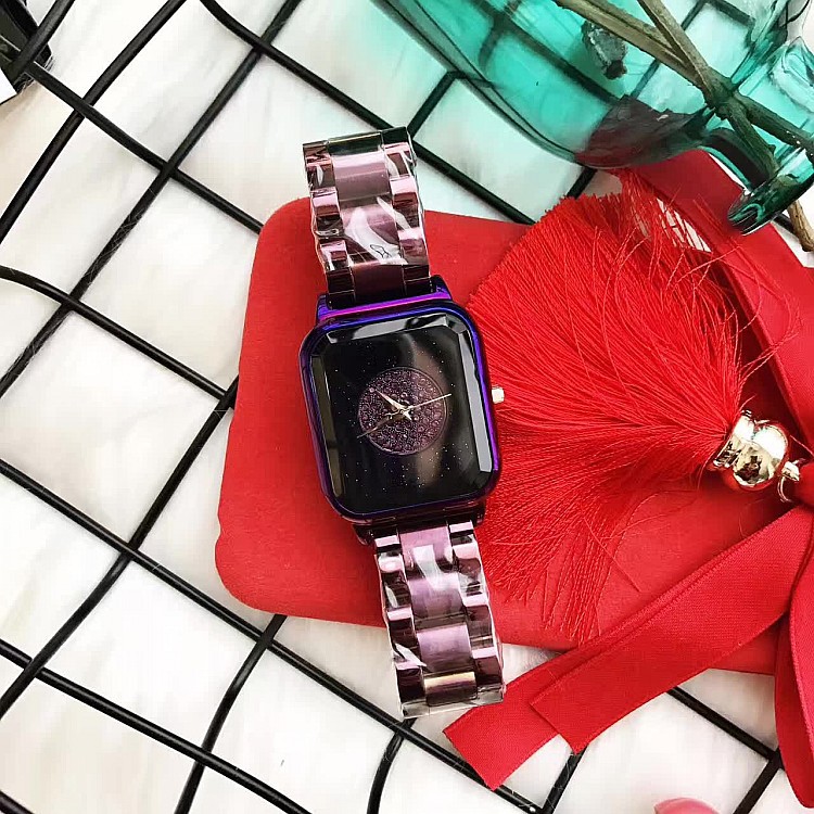 潮流個性方形時尚 星空面鑲鑽 紫色殼不銹鋼錶帶女士手錶Wat57